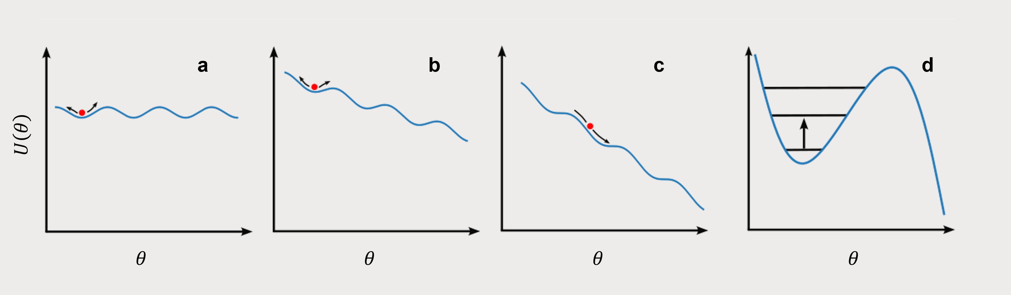 그림 3. 위상차(θ)에 따른 위상 입자(빨간색)의 퍼텐셜 에너지. a, b, c는 dc 전류가 0에서부터 점점 커지는 세 경우를 나타낸다. d는 위상 입자가 갇힌 퍼텐셜 우물과 양자화된 우물 속 에너지 준위이다.