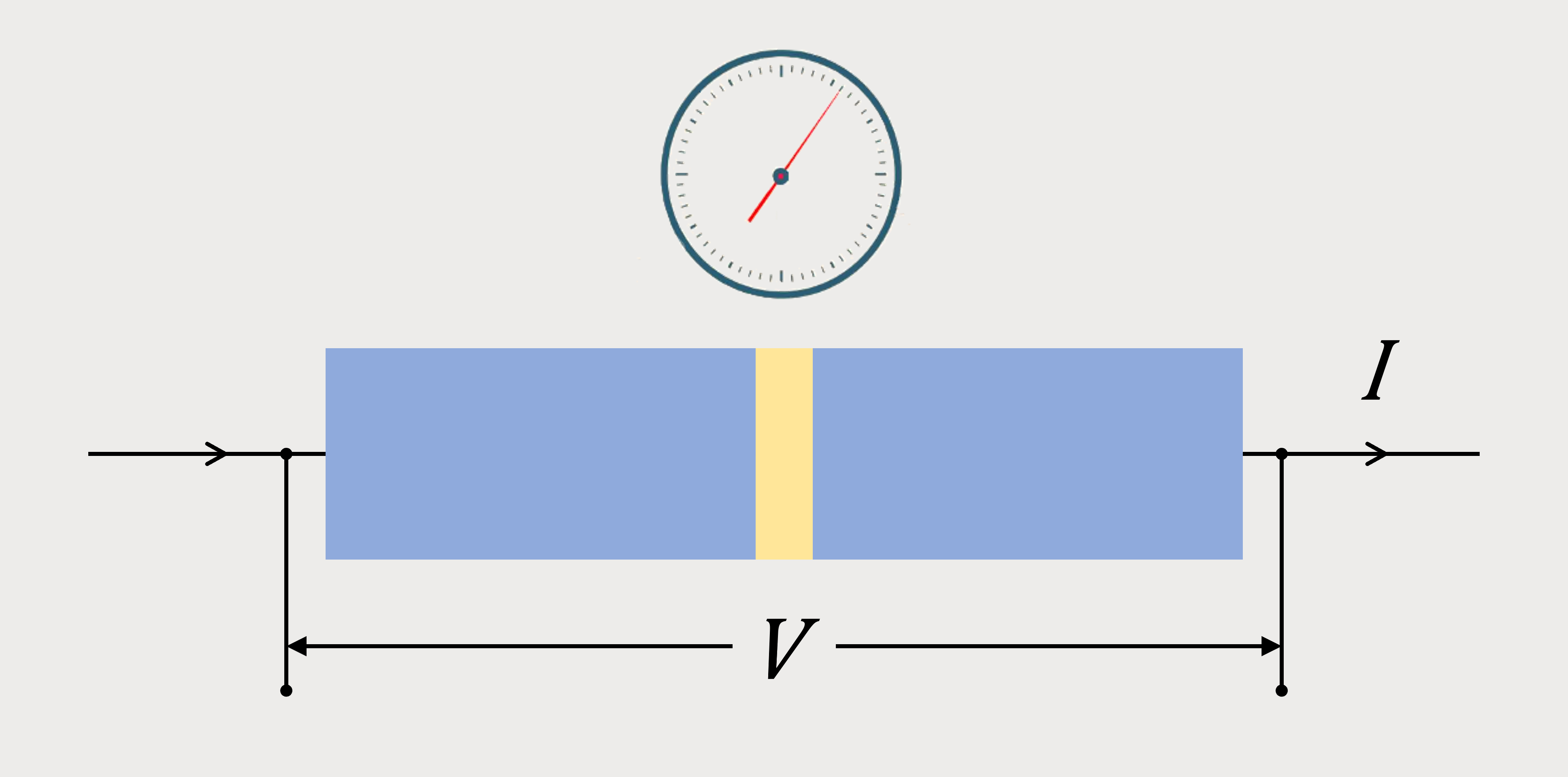 그림 2. 조셉슨 소자. 두 초전도체(파란색) 사이에 접합부(노란색)가 끼어있는 구조이다. I 와 V 는 각각 소자를 통과하는 초전류와 양단에 걸리는 전압을 의미한다.