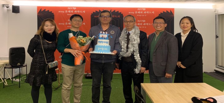 왼쪽부터 APCTP 이은희 과학문화위원, 손승우 과학문화위원장, 이명현 前 과학문화위원, 방윤규 소장, 정우성 사무총장, 이성빈 前 위원 지난해 12월 3일, 과학책방 ‘갈다’에서 APCTP 올해의 책 시상식과 갈다의 송년회가 열렸다. APCTP 사무국에서는 시상식 전에 이성빈 위원과 이명현 위원의 과학문화위원회 서프라이즈 퇴임식을 준비한다며 꽃과 케이크를 몰래 준비해달라고 연락을 했다. 직원들은 퇴임 행사에 걸맞게 글씨가 잘 보이는 아주 커다란 케이크를 주문했다. 시상식과 송년회가 끝난 그날 밤, 이명현은 뒷풀이로 간 식당 주인의 어머니가 생일이라는 말에 그 케이크를 건네고 나오면서 짐이 없어져서 좋다며 아이처럼 웃었다. 이명현은 과학문화계(?)에서 넓고 깊게 오랫동안 활동해오다가 과학책방 '갈다'를 오픈했다. 나는 '갈다' 준비를 하며 고용계약으로 이명현을 만났으니 아마도 내가 이 과학문화계에 가장 최근에 들어온 사람일 것이다. 그동안 그